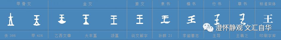 再看上图我的手绘版本,其实就是一个图形抽象流变的过程。但是为何甲骨文形态上面又加了一条横线,其实笔者也未思考出一个更合理的推断,有学者解释为加上一个横线代表指示符号,是最牛的那个钺,也就是持有最大的钺的人就是王,这有一定的道理。至于之后的流变其实就容易分析了,底下的钺越来越抽象化,这也代表着人类的思维进步,开始用抽象化的方式不断归纳生活,所以简化没了底下的钺的形状,成为了两横一竖。