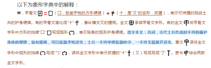 在解释该字之前,先引一段古代盾牌文化的截图以支持象形字典对“甲”字以盾牌为解释的支持,如下图。在原始时代,甲胄和盾牌作用相似,而甲骨文中记载的甲都是以盾的形势,因为这种直接手持而抵挡的方式更加直接而又简易化,试想一下金缕玉衣的制作难度吧所以,最初时期的防御还是盾牌更加节约时间和物质成本,“甲”来!而后来甲胄方有。这是随着生产力的发展而跟随发展的,没有任何客观实在能够逾越规律。