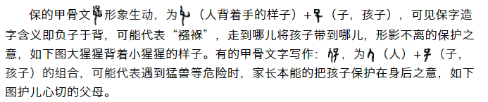 《说文解字》曰:“保,养也。从人,从省”,意为:保,养护孩子。字形采用“人”和省略了“爪”的“”会义。字形流变过程: