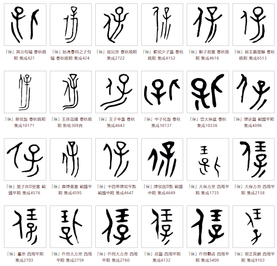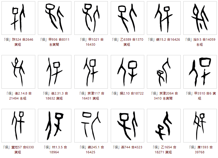 保的甲骨文基本为左右结构,由“人”+“子”两大要素构成,但组合方式多样,有的写法为人在左侧、子在右侧,有的写法为人在右侧、子在左侧,有的则为其他变化,那个时期的写法尚未标准化,故有多种字形。列举部分甲骨文字形如下: