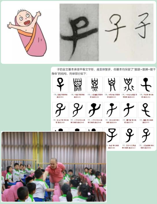 汉字到底是怎么来的呢?孙叔叔给孩子们分享了两个汉字“人”和“子”的来源。原来甲骨文中汉字的“人”像一个弯腰的士大夫,像一个面朝黄土背朝天的农民伯伯;而汉字“子”像一个襁褓中的小宝宝,有一个小脑袋和两只伸出的小手。同学在猜字中发现,原来我们的汉字这么有趣呀!