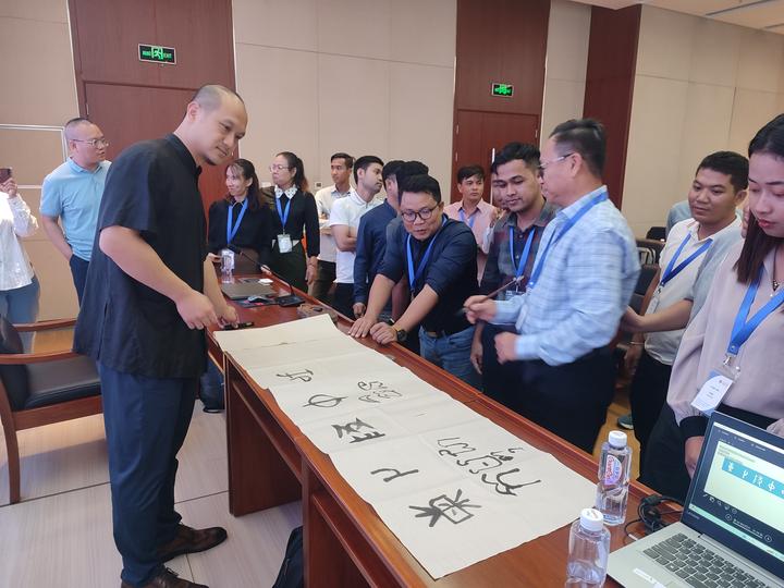 讲课中,孙老师与学员教学相长,沟通顺畅,频繁互动,讨论热烈,赢得学员的尊重。在介绍文房四宝时,孙老师向学员介绍了青州红丝砚、广饶齐笔、临朐桑皮纸等较有代表性的齐鲁文房四宝,随后邀请学员上台触摸古法造纸、感受研墨过程、体验毛笔书写,推动学员在可感环境下,较有带入性的感悟中华书写文化,最后以柬埔寨学员书写“柬埔寨中国”五个字结束培训。此次培训为国际友人介绍了中华优秀传统文化的发展经验,让学员感受到国学魅力,为推动文化自信和建立友好邦交做出了一定贡献。