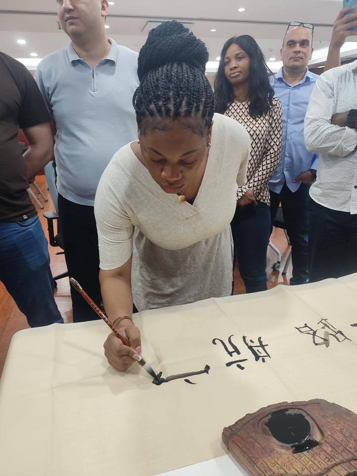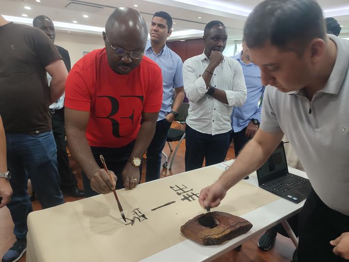 讲课中,孙老师与学员教学相长,沟通顺畅,频繁互动,讨论热烈,赢得学员的尊重。在介绍文房四宝时,孙老师向学员介绍了青州红丝砚、广饶齐笔、临朐桑皮纸等较有代表性的齐鲁文房四宝,随后邀请学员上台触摸古法造纸、感受研墨过程、体验毛笔书写,推动学员在可感环境下,较有带入性的感悟中华书写文化,学员靠自己努力,每人一字写下“一带一路航空运输班”,表达出“一带一路”国家,文化相通、 民心一致,通过旅游和人文交流将更加了解和亲密的情怀,一致认同未来世界都将是人类命运共同体内的兄弟姐妹。此次培训为国际友人介绍了中华优秀传统文化的发展经验,让学员感受到国学魅力,为推动文化自信和建立友好邦交做出了一定贡献。