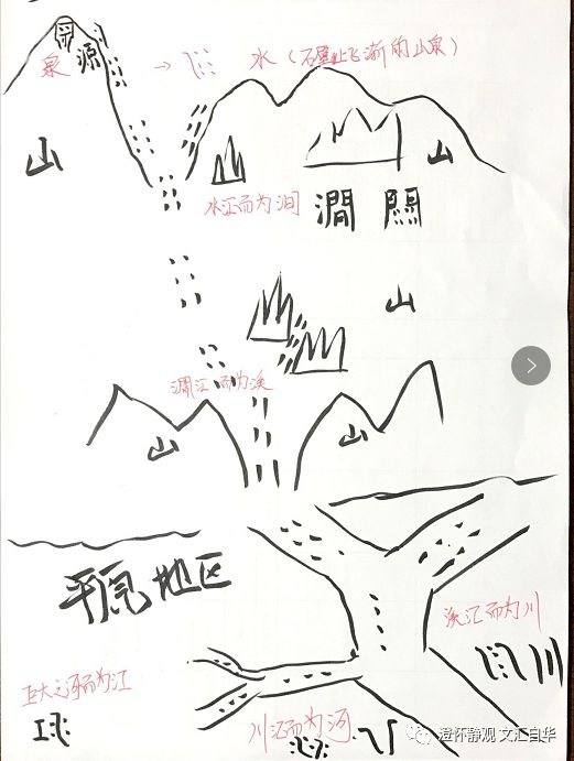 首先,这个“泉”应该不是趵突泉 珍珠泉等平地之泉,否则后面的“水”——石壁上溅起的山泉就无法解释了,所以呢,“泉”肯定只能是山上的泉眼,而且不大,所以才能有石壁溅起的那种感觉,直到水汇而为山涧,山涧慢慢就流到了山脚成为了小溪水,小溪水再向下流就到了平整地带成为了川。所以易经有彖传辞——利涉大川,这个后面慢慢讲。大川基本到了平原地带,再汇聚就成了江河。江不是特指长江,就是巨大的河的统称。下面逐字解释水的多种形态,还望斧正: