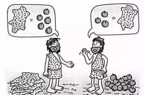 1、以物易物。货币出现是历史的必然选择。人类从树上爬下后,直立的行走让双手得以解放,从而获得了更多使用工具的可能性,于是脑容量也不断增加,改造自然的能力也越来越强,生产力随之提高。比如,人类的生产工具越来越先进,生产出了除满足自我生存外的更多产品,这就为交换创造了先决条件。交易就需要有个场所,这就有了“市”,如《易经系辞》曰:神农氏作……日中为市,致天下之民,聚天下之货,交易而退,各得其所。神农氏的时代“日中为市”,那时交换的品种应该不多,采取的形式是最传统的“以物易物”,如下图: