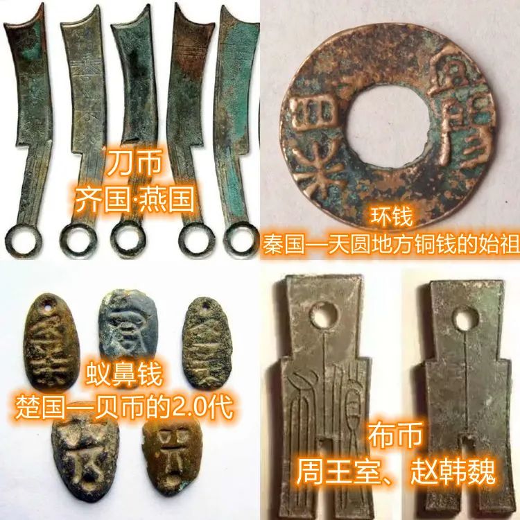 3、金银铜币。春秋战国左右,随着冶金水平的不断提高,贝币已退出历史舞台,铸币大肆流行,金银铜币是霸占货币历史时间最长的品种。春秋战国时的铸币形式已多种多样,有刀币,布币,蚁鼻钱和环钱等。如下图: