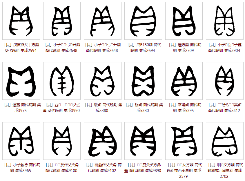 “贝”字甲骨文写法形如水生甲壳软体动物的外形,左右两瓣对称,中间咬合部有一条或两条齿状横纹。虽有诸多写法,但万变不离其宗,明显具有两瓣对称结构,如下图:
