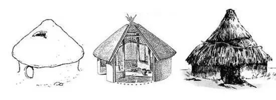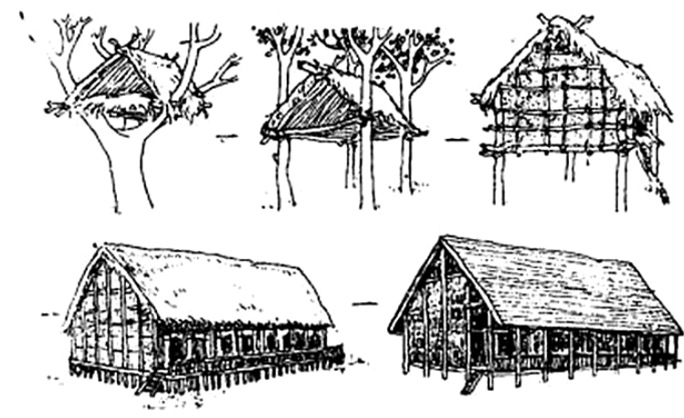 2、巢居为家的时代。周易古籍中有关于穴居转干栏式巢居的记载:"上古穴居而野处,后世圣人易之以宫室,上栋下宇,以待风雨,盖取诸大壮。"传说圣人“有巢氏”最早改变了穴居环境,发明了巢居穴式住宿方式,也是后期干栏式房屋结构的雏形。其得益于生产力的进步,也更有利于人类的生存的改善,自此人来开始更多关注门户使用。如下图: