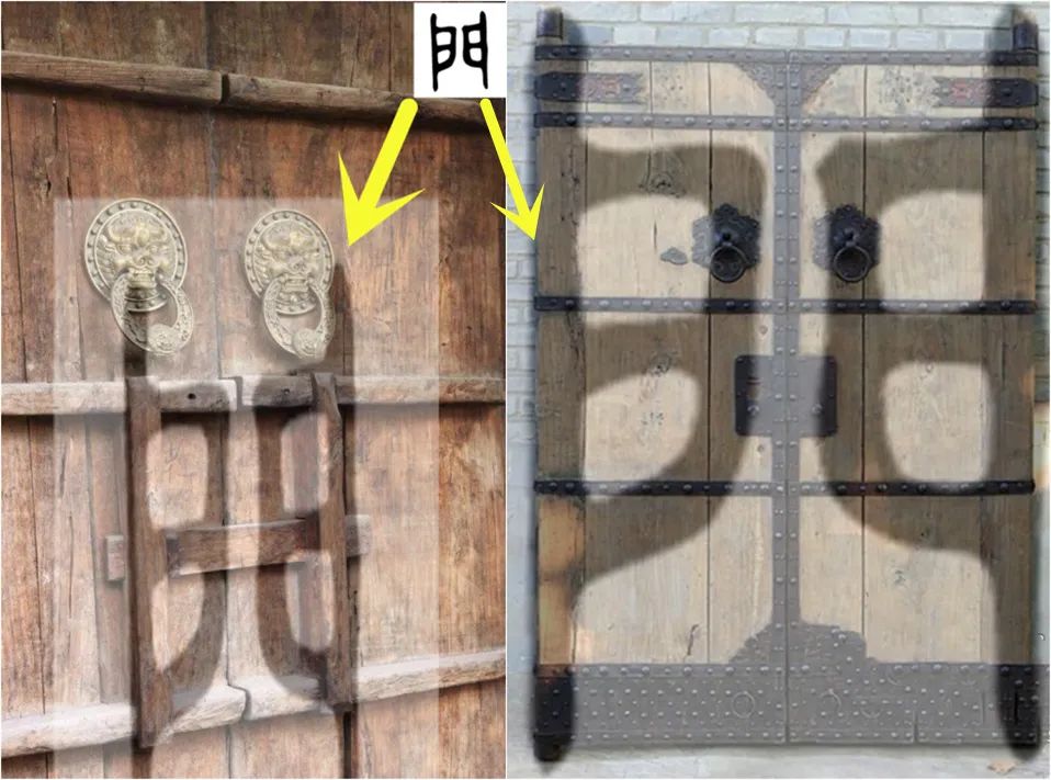 因门闩结构同“门”字甲骨文相似,学术界也有“门”字是根据门闩结构而来的猜测,但大概率不成立,因门闩不止一种定式。甲骨文如此写法,更可能因门轴必须比门板长方能固定,故门轴比门板上下都长出一截。如下图所示: