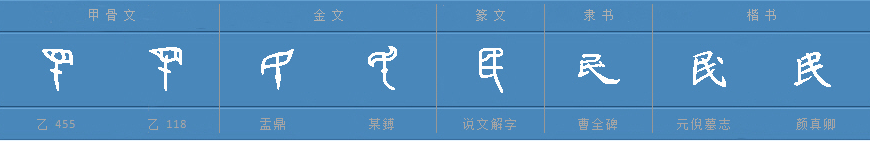 《说文解字》民:民,眾(众)萌也。从古文之象。凡民之属皆从民。