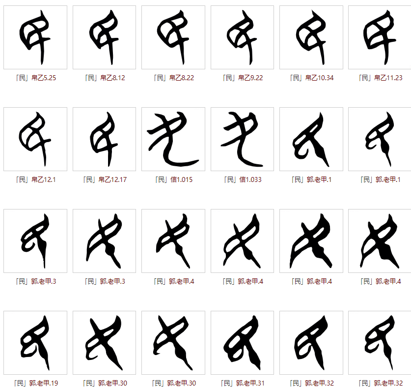 简帛时期“民”之字形众多,上半部分均为有眼无珠形态,但下半部分的呈现形式多样,有的呈现甲骨文时期有刀柄形态,有的保持金文时期无柄形态,有的变形为带尾的形态。罗列部分以作参考: