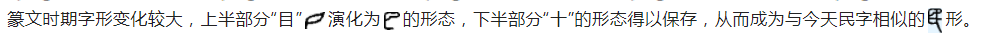 甲骨文时期形为图片(目,眼睛)和图片(十,‘又’的变体or利刃)的组合,其中“目”代表眼睛已形成共识,但下半部分图片具体指代什么,暂无统一定论。已发现的甲骨文形态如下: