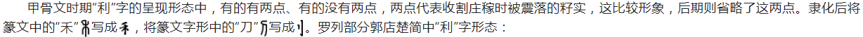 “利”字字形流变的过程中变化不大,时至今日亦是“禾”+“刂”的组合,代表以锋利之刀收割庄稼。字形流变过程: