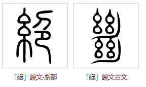 金文时期更为直观的在两组丝线之间加一把刀,示意以刀断丝;篆文时期则形成了“丝+刀+人”的组合,表示人以刀断丝,絶字由三部分构成的字形基本定型,小篆时期该字的表现形式中,有的加入“人”字。如下图,左边字右下角符号为“人”,右边字则无“人”。