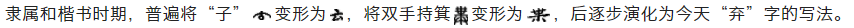 弃 ——双手将装着婴幼儿的箕筐推出,意为抛弃。郭店楚简原字如下:
