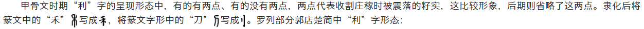 “利”字字形流变的过程中变化不大,时至今日亦是“禾”+“刂”的组合,代表以锋利之刀收割庄稼。字形流变过程: