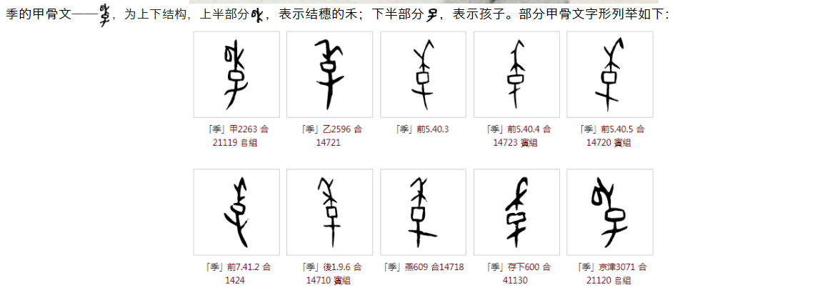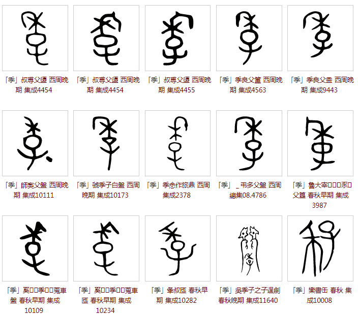 ,基本延续了甲骨文上下结构字形,但亦有左右结构形态(禾在座、子在右),不知是否以比禾苗还矮的孩子指代家中的老幺?“季”字中的禾苗一般为沉甸甸结穗的禾苗,穗内是种子,不知是否以种子表示最新最小的生命,以指代家中的老幺?还有学者推论,禾成熟于秋季,代表禾有最后一茬作物之意,“禾+子”也就代表了家中最后出生的孩子。众说纷纭,暂无最佳答案。部分金文字形列举如下: