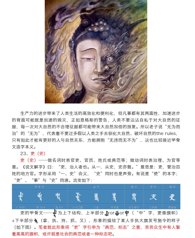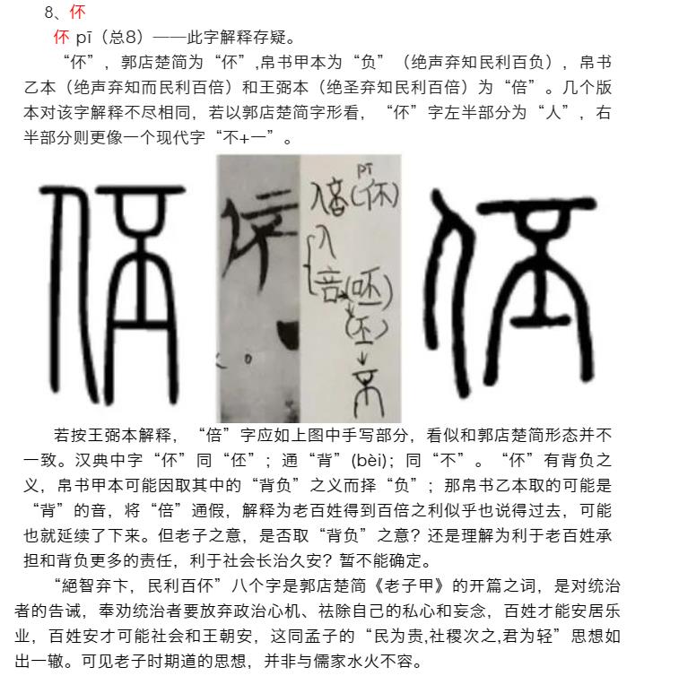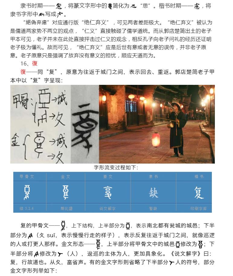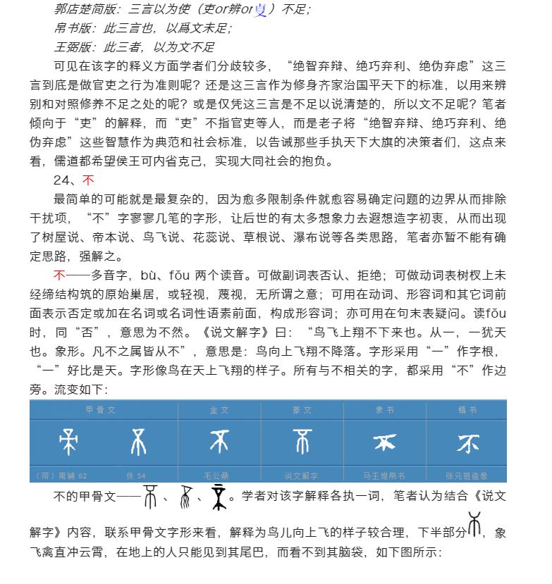 本字典以郭店楚简《老子》中文字先后顺序为呈现逻辑,研述甲骨文至简体字的文字衍化顺序,期待于其过程中体味老子思想的本质和精华。需要指出的是,对甲骨文的理解是一个不断深化和升华的过程,故本字典也将不断鼎故革新,在否定之否定中扬弃和进步。