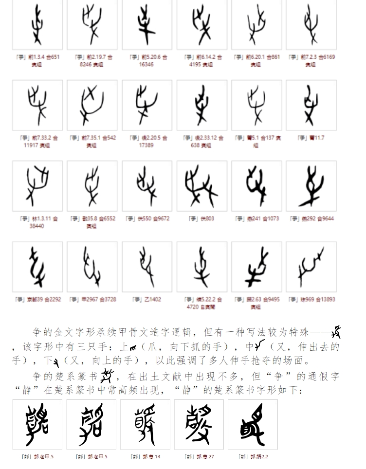 争的甲骨文写法较多,基本逻辑均为两手抢夺一U形条状物,不过有的写法条形物体被拉扯断了,有的写法条形物体保持完整。列举如下:
