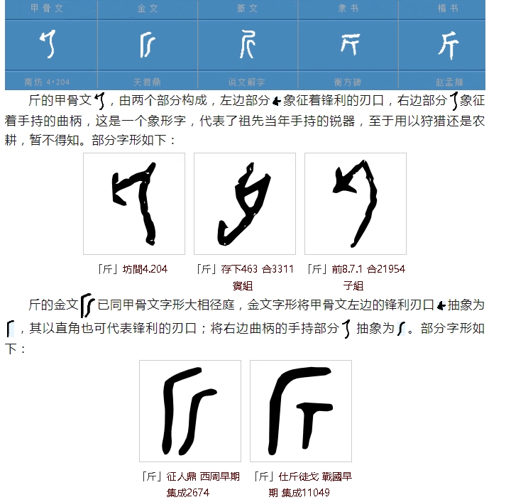 《说文解字》曰:“斤,斫木也,象形。凡斤之属皆从斤”,意思即“斤,用来砍木头的斧子。字形像斧头的形状。所有与斤相关的字,都采用“斤”作边旁”。字形流变如下: