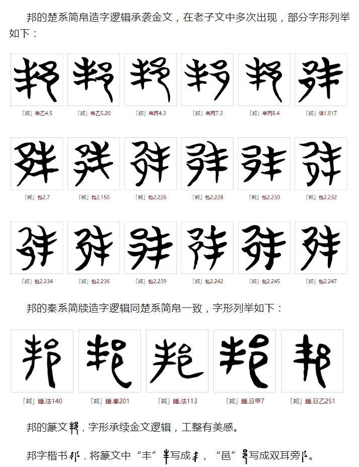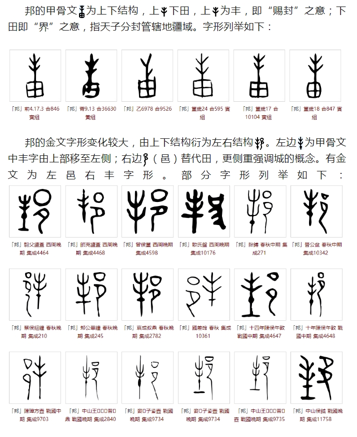 《说文解字》曰:邦,國也。从邑,丰聲。古文邦。意为:邦,诸侯封国。字形采用“邑”作边旁,采用“丰”作声旁。为“邦”的古文写法。