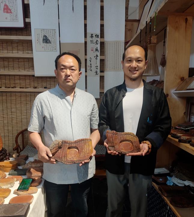 同时,非遗传承人王发刚老师作为土生土长的青州人,自幼酷爱红丝石,喜爱雕刻红丝砚。王老师作为山东工艺美术协会会员、制砚名家遍历红丝石各大坑口,深入了解各个坑口红丝石的石性和特点。两人经多次讨论和交流,各抒己见、相互融合,最终确定了以《郭店楚简·老子》为内容,选取11个典型坑口的特色红丝石为载体进行创作,《郭店楚简·老子红丝砚雕集》正文2046字、使用红丝砚22方、历时6个月。砚雕集有四大特征:(1)素材方面。老子思想被全世界喜爱,《老子道德经》是全球发行量仅次于《圣经》的经典IP,砚雕集以现存老子最早版本——《郭店楚简·老子》为蓝本,希望弘扬中华优秀传统文化,开发老子IP的新文创产品;(2)用料方面。砚雕集收集青州和临朐11大特色坑口红丝石原料,旨在打造一套红丝砚石材的大百科全书,让受众在一部砚雕集中就可直观感受到11大主流坑口的红丝石特性;(3)雕刻方面。砚雕集使用独特的古文字雕刻工艺,将《郭店楚简·老子》共71枚,2046字正文的楚系篆文雕刻于红丝砚上,文字跃然纸上、灵动传神,体现了大国工匠的技巧和匠心。(4)衍生品方面。《郭店楚简·老子红丝砚雕集》是中国楚系篆文的优美表达,拥有较高的文化价值和审美价值,为更好传播砚雕集文化,开发了拓印、扇面等文创产品,丰富了非遗产品的传承渠道。