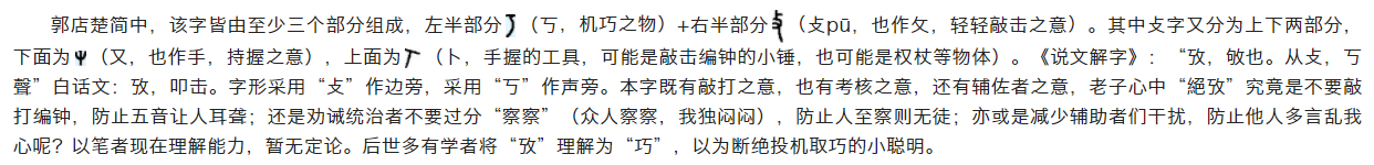 “絕攷弃利”四个字是郭店楚简《老子甲》的第二句开篇四字。“绝”字理解为“断绝、戒除”和“绝妙”则意义大有不同:如为“绝妙”,则四字可谓“最绝妙的技法是抛弃物之利的诱惑”,如为“戒除”,则四字可谓“戒除机巧和察察之智,抛弃对物之利、免除诱惑”。理解老子是一个长期否定之否定的过程,在不断扬弃中感悟更深的道理。