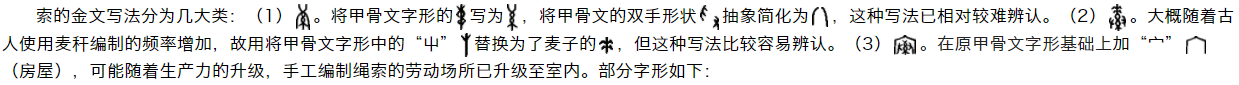 《说文解字》曰:“索,艸有茎叶,可作绳索”,意为“索,草有茎和叶,可用来制作绳索”。字形流变过程: