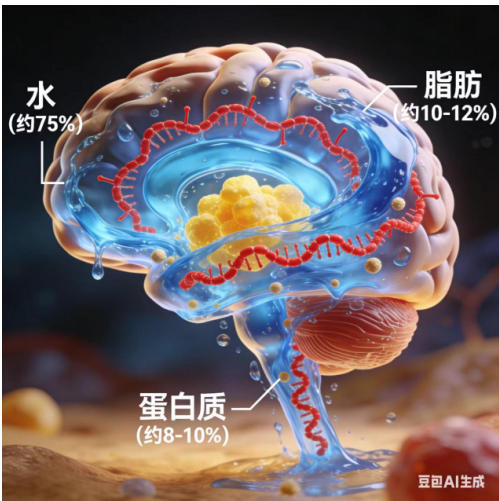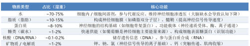 ③蛋白质是神经细胞的结构基础(细胞骨架蛋白类似房子的四梁八柱支撑系统)、功能载体(离子通道、神经递质受体及运输载体;作为酶催化所有生化反应),总之,是大脑结构和功能的执行者。④糖类,主要是葡萄糖,类似汽车的汽油,是大脑几乎所有活动的直接能量来源,细胞表面糖蛋白具备识别功能。⑤核酸,负责储存遗传信息(DNA),类似现在涨价的存储芯片;参与蛋白质合成(RNA),这部分含量少但很重要,类似电脑中的程序。另外,还有矿物质、电解质等,如钠(Na⁺)、钾(K⁺)、钙(Ca²⁺)、氯(Cl⁻)是产生和传导神经电信号的基础;如锌(Zn)、铁(Fe)、铜(Cu)作为酶的核心辅基,参与神经递质合成、能量代谢和抗氧化等关键过程。