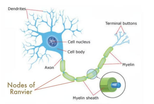 ②脂质构成神经细胞膜(如磷脂双分子层)和髓鞘。髓鞘类似电线外面的绝缘外皮,是包裹神经纤维的脂质绝缘层,它有神奇的“郎飞氏结”构造,能够提高神经信号传导速度、降低能耗,大脑的能耗之低让现代所有算力设备望洋兴叹,脂质还是高密度的能量储备。