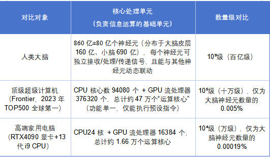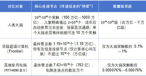“动态生长的智能系统”,而计算机是“固定结构的工具”。前者能在低功耗下实现“自我修复、自主学习”,后者暂时因为没有智能而无法复制这种复杂性。