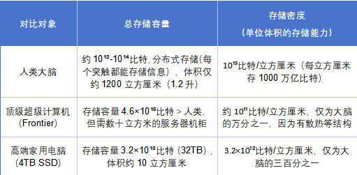 “一个矿泉水瓶”的体积,存下了相当于12.5万个1TB硬盘的内容;而超级计算机要存同样多的信息,需要一间100平米的房子——且大脑还能“即存即取”(比如瞬间回忆起童年画面,梦中的调取速度甚至更快),计算机调取海量数据时需要等待加载。