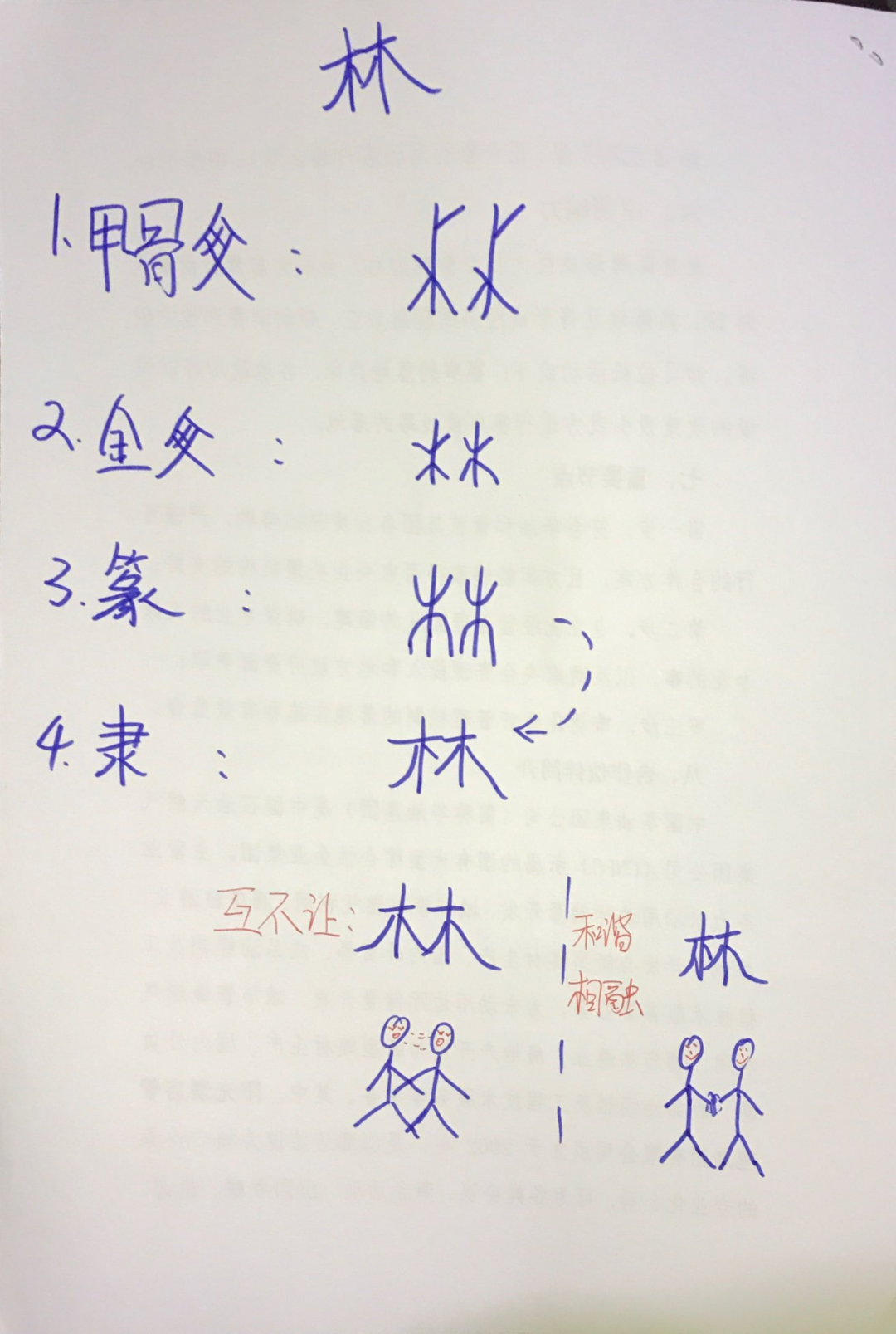 “林”字是甲骨文中较易辨认的字,属会意字,是两木相连的样子。《説文解字》曰“林,平土有叢木曰林。从二木”,就是形容“平坦地面上有丛生的树木”。范晔“高树靡阴,独木不林”和李康“木秀于林,风必摧之”是耳熟能详的关于“林”的句子。