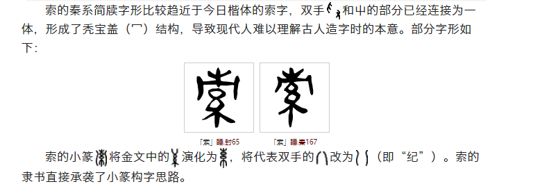 索的秦系简牍字形比较趋近于今日楷体的索字,双手和屮的部分已经连接为一体,形成了秃宝盖(冖)结构,导致现代人难以理解古人造字时的本意。部分字形如下:
