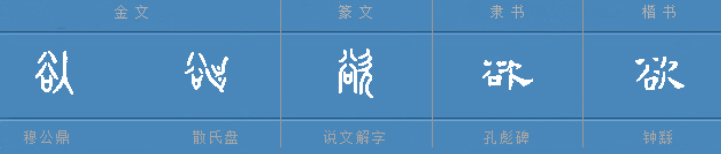 《说文解字》曰:“贪欲也,从欠谷声”,意思即“欲,贪欲也。字形采用“欠”作边旁,采用“谷”作声旁”。字形流变如下: